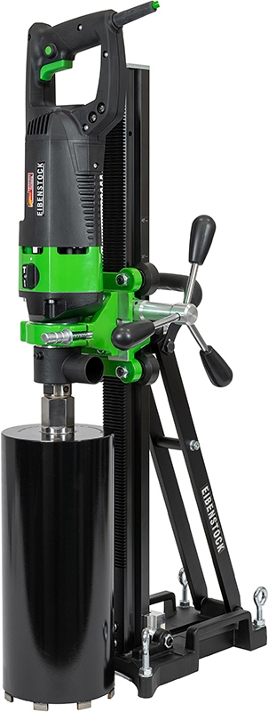 Установка с микроударом для сухого алмазного бурения Eibenstock DSE 162 (Айбеншток ДСЕ 162) предназначена для ручного и стационарного сухого сверления отверстий оптимально Ø 82 – 162 мм и максимально Ø 82 – 202 мм с микроударом в особо твердых материалах, например, таких, как: железобетон, высокоплотный силикатный кирпич и кирпичная кладка, каменная кладка; под углом до 45°; без подачи воды; с высокой рабочей скоростью; при создание отверстий в стенах и потолках в системах водоснабжения, отопления и вентиляции, где условия на площадке не позволяют проводить мокрое сверление (полые потолки и т. д. / предотвращение повреждения водой).